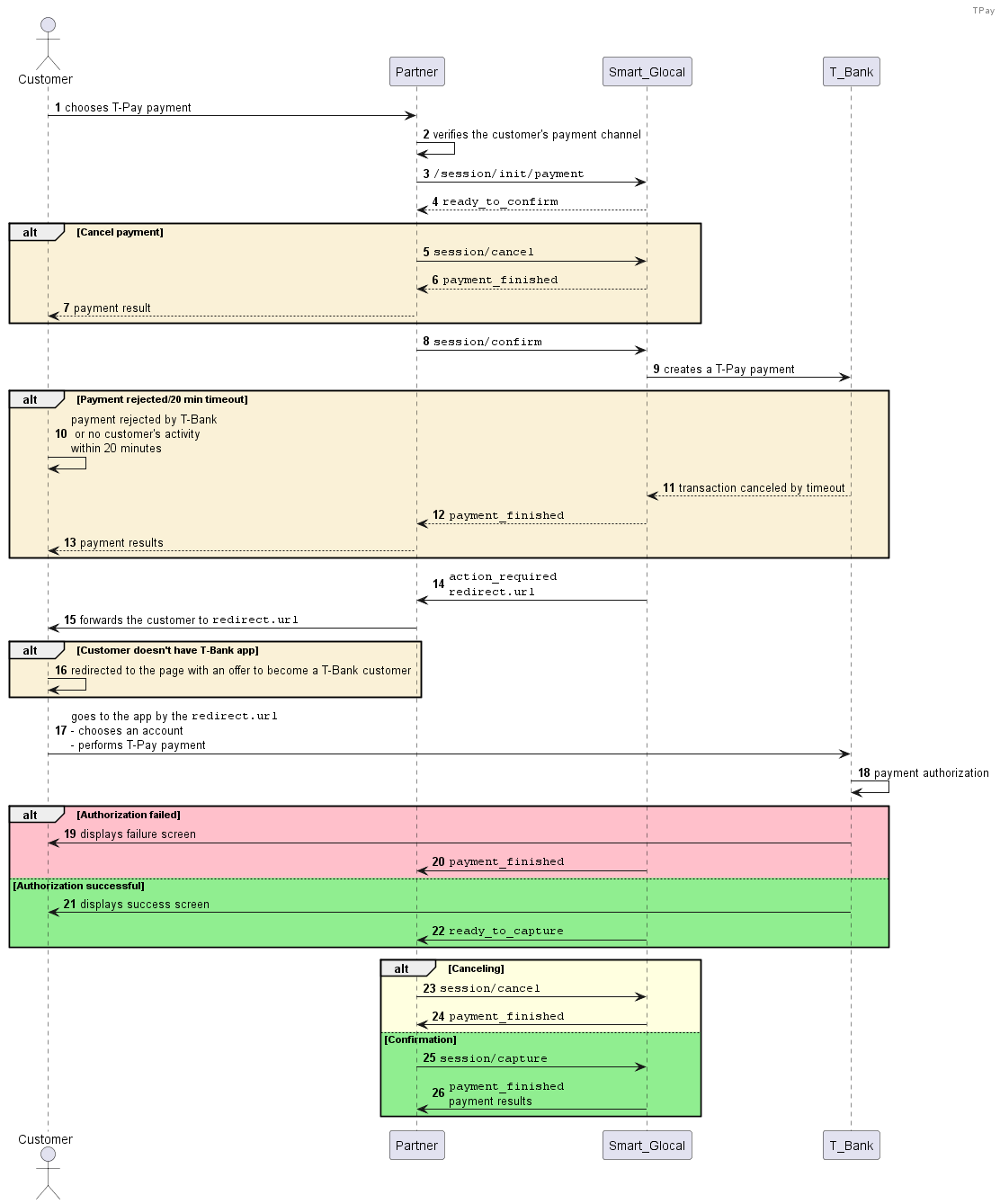 redirect.urlparameter to the T-Bank mobile application. Wait til the customer approves or cancels the payment. -
